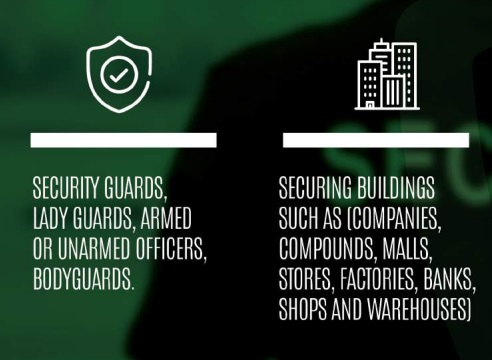 securing buildings such as ( companies , compounds , malls ,stores ,factories ,banks ,shops and warehouses ).