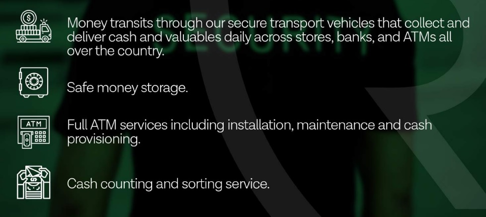 Money transits through Our secure transport vehicles that collect and deliver cash and valuables daily across stores, banks, and ATMs all over the country.